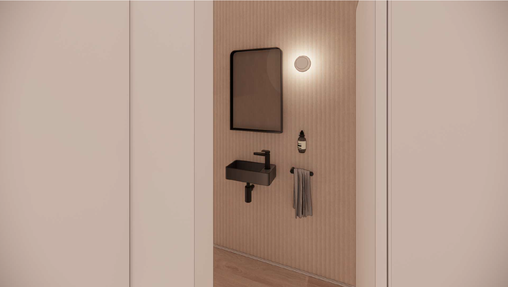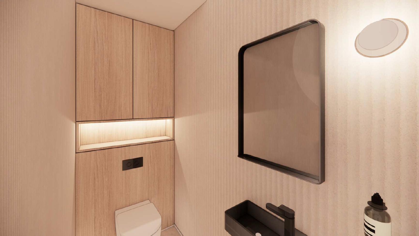 This custom design project fuses contemporary boldness with serene Japanese-inspired styling. We created a complete suite of custom cabinetry, blending striking colors with rich textures.