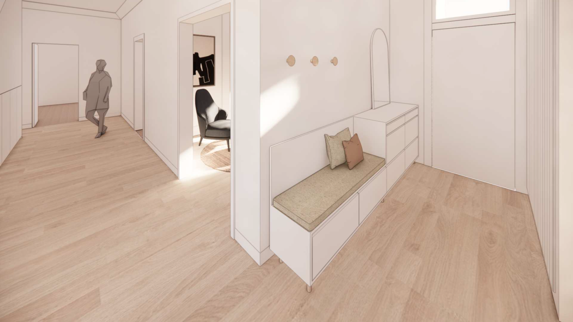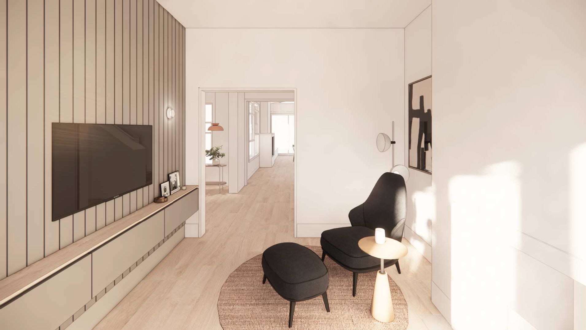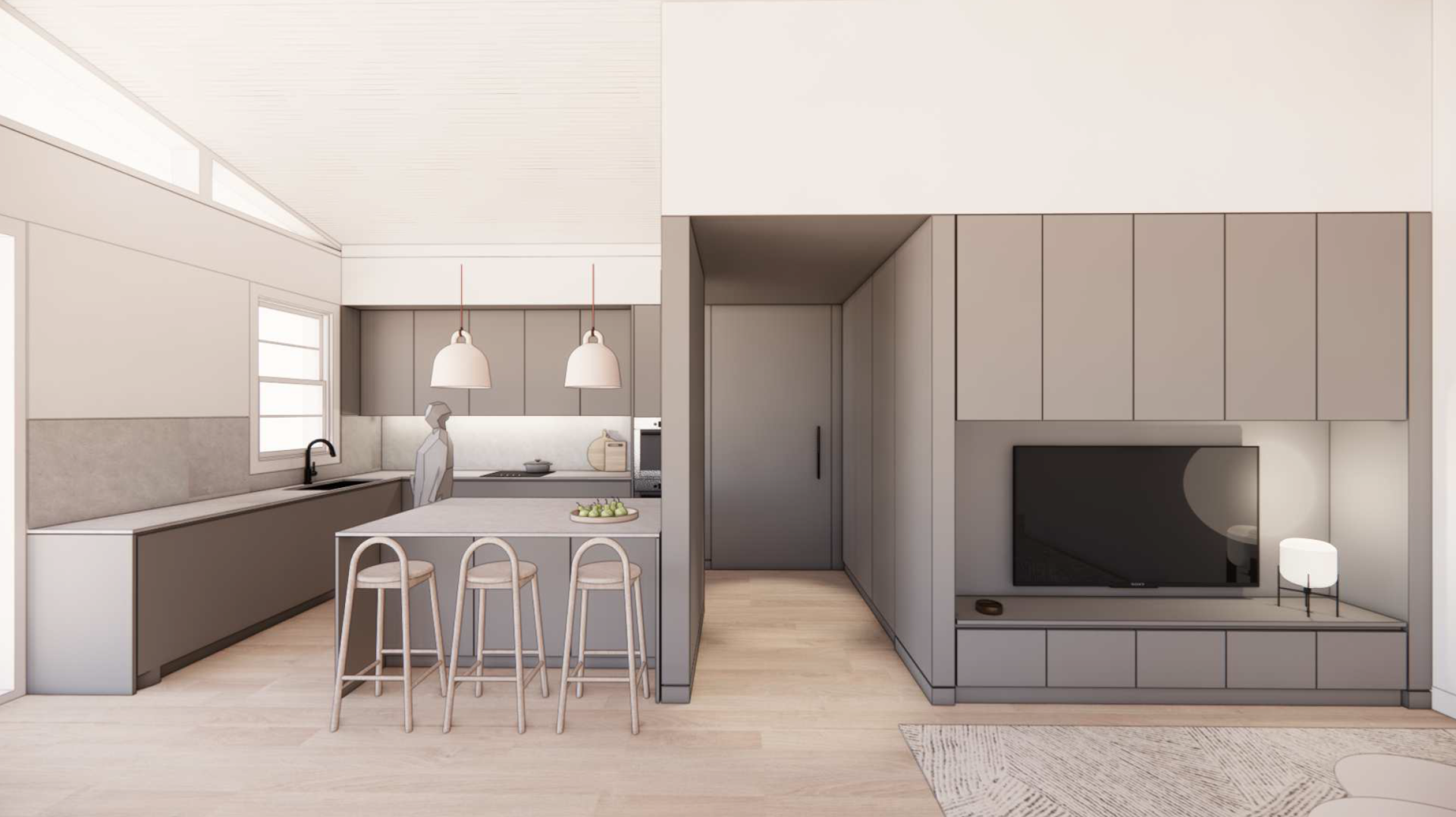 The space features thoughtful oriental influences, including a functional Tatami area with integrated storage. Every detail is grounded in natural elements and tones, meticulously planned to harmonize with the natural light, resulting in a home that is both visually dramatic and deeply cozy.